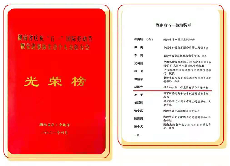 2021年4月29日上午,湖南省慶?!拔逡弧眹?guó)際勞動(dòng)節(jié)暨先進(jìn)集體先進(jìn)個(gè)人表彰大會(huì)在長(zhǎng)沙召開。中共湖南省委書記、省人大常委會(huì)主任許達(dá)哲,省委副書記、省長(zhǎng)毛偉明,省領(lǐng)導(dǎo)謝建輝、張劍飛、馮毅、吳桂英、周農(nóng)、陳飛出席。綠之韻集團(tuán)董事長(zhǎng)胡國(guó)安參加會(huì)議,并被光榮授予“湖南省五一勞動(dòng)獎(jiǎng)?wù)隆睒s譽(yù)。