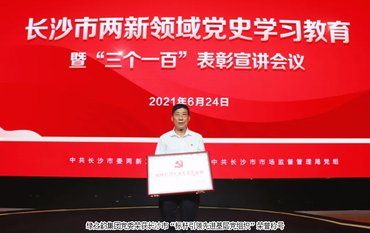 2021年6月24日,長沙市兩新領(lǐng)域黨史學(xué)習(xí)教育暨“三個(gè)一百”表彰宣講會(huì)召開。中共長沙市委常委、市委組織部部長張宏益,市政協(xié)副主席、民盟市委主委、市市場監(jiān)督管理局局長張慶和,中共長沙市委組織部副部長、兩新工委書記、基層辦主任楊俊,市民政局黨委書記、局長、市委兩新工委副書記陳昌佳,市市場監(jiān)督局黨組書記、市委兩新工委副書記邱山東,市委兩新工委專職副書記肖劍鋒等領(lǐng)導(dǎo)出席會(huì)議。綠之韻集團(tuán)黨委副書記許達(dá)仲參加會(huì)議。會(huì)上,綠之韻集團(tuán)黨委榮獲長沙市“標(biāo)桿引領(lǐng)先進(jìn)基層黨組織”榮譽(yù)稱號(hào)。