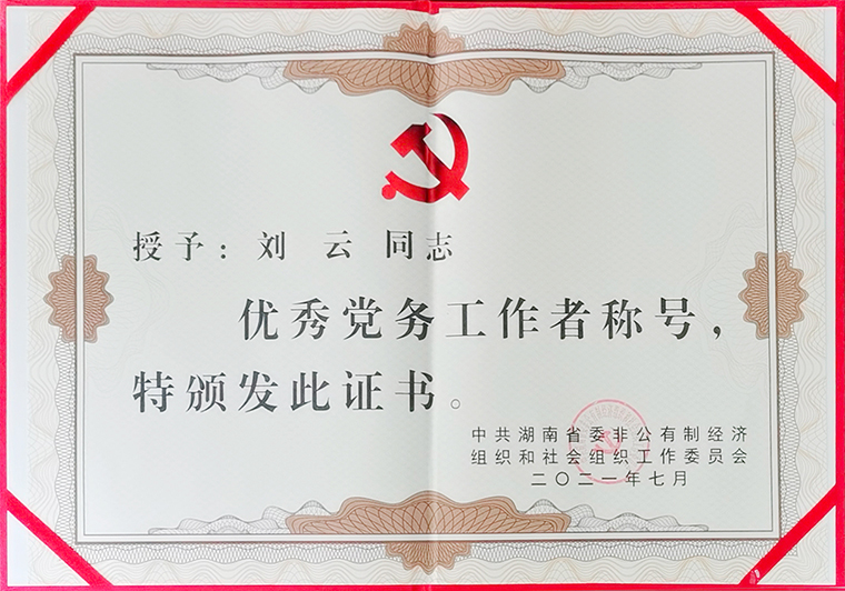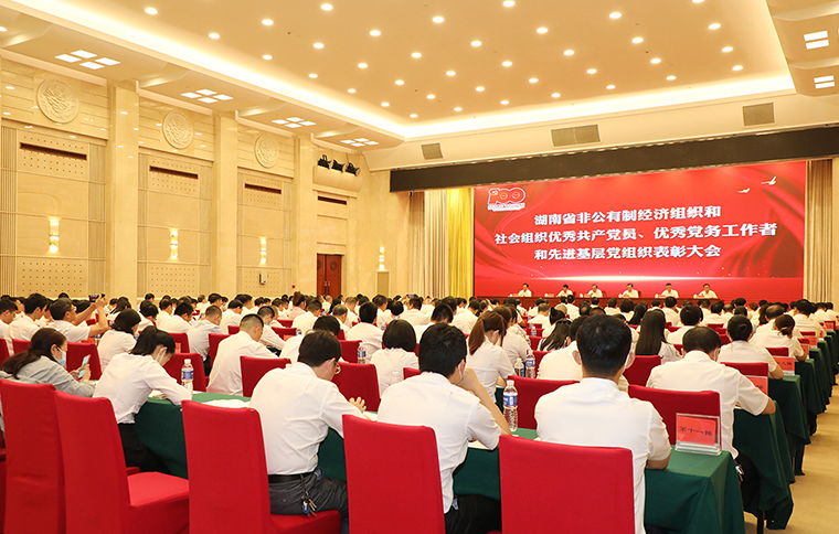 中共湖南省委組織部副部長陳瀟主持會議。大會伊始,全體起立,共唱國歌。中共湖南省委兩新工委專職副書記羅纘吉宣讀表彰文件。大會表彰一批湖南省非公有制經(jīng)濟組織和社會組織優(yōu)秀共產(chǎn)黨員、優(yōu)秀黨務(wù)工作者和先進(jìn)基層黨組織。與會領(lǐng)導(dǎo)為獲獎代表頒發(fā)獎牌和榮譽證書。綠之韻集團黨委書記劉云榮獲“優(yōu)秀黨務(wù)工作者”榮譽。