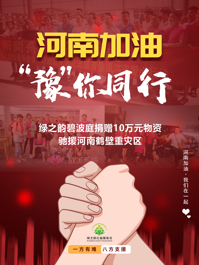 碧見真情,“豫”你同行。一聲加油,一種溫暖。綠之韻將持續(xù)關(guān)注河南各地災(zāi)情,與當(dāng)?shù)厥聵I(yè)伙伴和愛心志愿者送去力所能及的幫助。我們相信,只要大家團結(jié)一致,有力、有序、有效地開展防汛救災(zāi)工作,定能共同奪取此次防汛救災(zāi)的最后勝利。加油!河南的同胞們,我們一直與你們在一起!