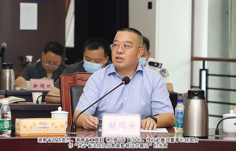 2021年8月24日,為廣泛聽取社會各界對法院工作和法院隊伍的意見建議,切實提升省法院隊伍教育整頓工作成效,湖南省高級人民法院隊伍教育整頓座談會在長沙召開。湖南省高級人民法院黨組書記、院長田立文,黨組副書記、副院長鄔文生,省紀委省監(jiān)委駐省法院紀檢監(jiān)察組組長、省法院黨組成員粟志遠,黨組成員、政治部主任董嵐等領(lǐng)導(dǎo)出席會議。湖南省政協(xié)委員、湖南省工商聯(lián)(總商會)副會長、綠之韻集團董事長胡國安受邀參加會議。