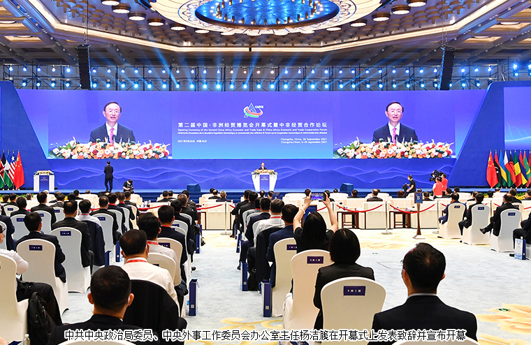 2021年9月26日,第二屆中國-非洲經(jīng)貿(mào)博覽會暨中非經(jīng)貿(mào)合作論壇在長沙隆重開幕。開幕式上,中共中央政治局委員、中央外事工作委員會辦公室主任楊潔篪致辭并宣布開幕。楊潔篪在致辭中說,中國和非洲是命運與共、志同道合的好朋友、好伙伴、好兄弟。習(xí)近平主席親自提出真實親誠對非政策理念和正確義利觀,親自推動構(gòu)建更加緊密的中非命運共同體,中非政治互信日益牢固,貿(mào)易投資、基礎(chǔ)設(shè)施、新興產(chǎn)業(yè)等領(lǐng)域務(wù)實合作碩果累累。