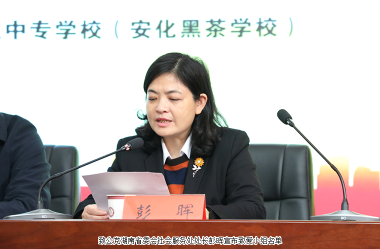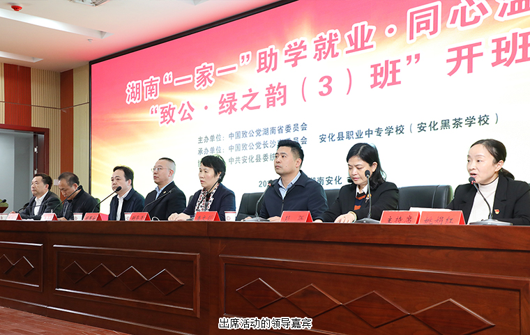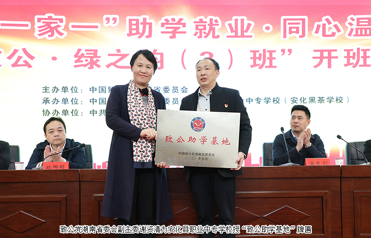 2021年11月16日,湖南“一家一”助學(xué)就業(yè)·同心溫暖工程“致公·綠之韻3班”開(kāi)班儀式暨致愛(ài)小組活動(dòng)在安化縣職業(yè)中專(zhuān)學(xué)校(安化縣黑茶學(xué)校)舉行。全國(guó)人大代表、致公黨湖南省委會(huì)副主委、湖南師范大學(xué)副校長(zhǎng)謝資清,致公黨湖南省委會(huì)社會(huì)服務(wù)處處長(zhǎng)彭暉,致公黨長(zhǎng)沙市委會(huì)秘書(shū)長(zhǎng)兼辦公室主任歐陽(yáng)明等出席活動(dòng),中共安化縣委副書(shū)記、統(tǒng)戰(zhàn)部部長(zhǎng)潘文劍,中共安化縣委統(tǒng)戰(zhàn)部副部長(zhǎng)姚娟紅,安化縣教育局黨組成員、副局長(zhǎng)劉勝輝,湖南省政協(xié)委員、致公黨湖南省委會(huì)互聯(lián)網(wǎng)+專(zhuān)委會(huì)名譽(yù)主任、綠之韻集團(tuán)董事長(zhǎng)胡國(guó)安,瀏陽(yáng)市政協(xié)委員、致公黨湖南省委會(huì)互聯(lián)網(wǎng)+專(zhuān)委會(huì)秘書(shū)長(zhǎng)、綠之韻公益基金會(huì)秘書(shū)長(zhǎng)蔣文等參加開(kāi)班儀式。安化縣職業(yè)中專(zhuān)學(xué)校(安化縣黑茶學(xué)校)黨總支書(shū)記、校長(zhǎng)劉迪凡帶領(lǐng)學(xué)校領(lǐng)導(dǎo)班子成員、部分教師和學(xué)生代表參加活動(dòng)。