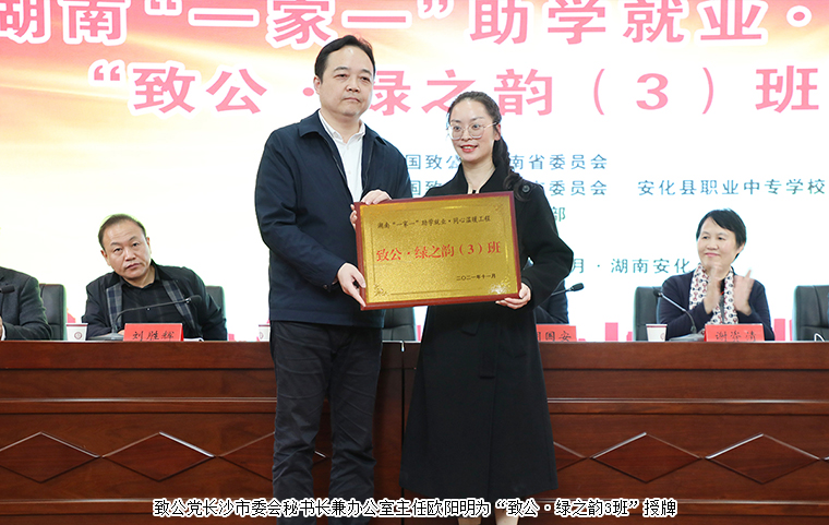 開(kāi)班儀式上,安化縣教育局黨組成員、副局長(zhǎng)劉勝輝致歡迎辭,致公黨湖南省委會(huì)副主委謝資清為安化縣職業(yè)中專(zhuān)學(xué)校(安化縣黑茶學(xué)校)授“致公助學(xué)基地”牌匾,致公黨長(zhǎng)沙市委會(huì)秘書(shū)長(zhǎng)兼辦公室主任歐陽(yáng)明為“致公·綠之韻3班”授牌;湖南省政協(xié)委員、致公黨湖南省委會(huì)互聯(lián)網(wǎng)+專(zhuān)委會(huì)名譽(yù)主任、綠之韻集團(tuán)董事長(zhǎng)胡國(guó)安向安化縣職業(yè)中專(zhuān)學(xué)校(安化縣黑茶學(xué)校)捐贈(zèng)20萬(wàn)元,用于“致公·綠之韻3班”建設(shè)和專(zhuān)業(yè)人才培養(yǎng)。