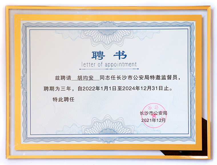 據(jù)了解,長沙市公安局特邀監(jiān)督員的主要職責(zé)是對全市公安機(jī)關(guān)和公安民警、輔協(xié)警及其他工作人員履行職責(zé)、執(zhí)法執(zhí)勤和遵紀(jì)守法情況實(shí)施監(jiān)督;反映、轉(zhuǎn)遞人民群眾對公安機(jī)關(guān)和公安民警、輔協(xié)警及其他工作人員違紀(jì)違法行為的檢舉、控告;反映人民群眾對公安工作和隊(duì)伍建設(shè)的意見和建議等,充分發(fā)揮“警民連心橋”“警務(wù)智囊團(tuán)”“警風(fēng)監(jiān)督員”的作用。對于再次當(dāng)選市局特邀監(jiān)督員,胡均安副總裁表示:特邀監(jiān)督員這個(gè)身份有一種厚重的使命感和責(zé)任感。這個(gè)聘書是沉甸甸的,不僅是一種光榮,更肩負(fù)著普通民眾的矚托。我一定不辜負(fù)市局黨委的期望,積極建言獻(xiàn)策,發(fā)揮好監(jiān)督、橋梁和參謀作用,為公安工作和隊(duì)伍建設(shè)多做貢獻(xiàn)。
