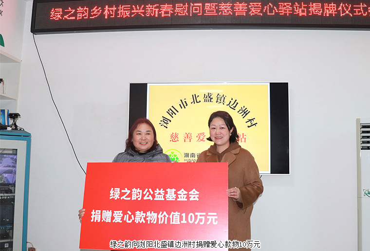 春節(jié)慰問送溫暖,暖冬關(guān)愛顯真情。2022年1月13日,綠之韻鄉(xiāng)村振興建設(shè)暨新春慰問活動(dòng)走進(jìn)瀏陽北盛鎮(zhèn)邊洲村。綠之韻再次向邊洲村捐贈(zèng)10萬元愛心款物,主要用于邊洲村鄉(xiāng)村振興建設(shè)和困難群眾新春慰問等,并與村委共建慈善愛心驛站,希望影響更多的愛心企業(yè)和人士來到愛心驛站奉獻(xiàn)愛心,輸送溫暖。