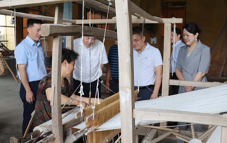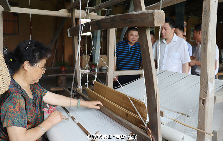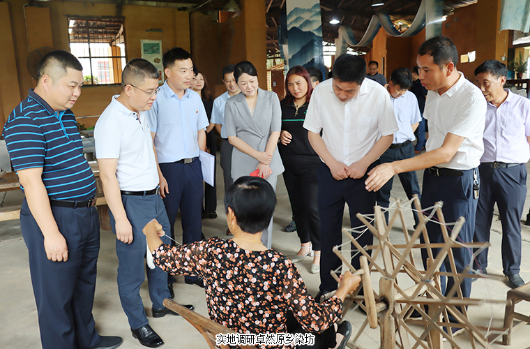 調(diào)研組一行首先來(lái)到卓然原鄉(xiāng)染坊就非遺傳承保護(hù)、文旅融合發(fā)展等工作進(jìn)行考察,深入了解了原鄉(xiāng)染坊目前的經(jīng)營(yíng)情況。原鄉(xiāng)染坊作為北盛鎮(zhèn)撈刀河畔·田園綜合體項(xiàng)目的旅游休閑項(xiàng)目,其織布、染色都是采用“古法”操作,即紡織女工們用木制紡車紡出一匹匹夏布后,染色師傅們?cè)儆脧淖咳淮迨召?gòu)的荷花、荷葉、蓮蓬以及其他植物中提煉的染料給布匹著色。目前,染坊兼具生產(chǎn)、研學(xué)、文創(chuàng)三大功能,同時(shí)圍繞染坊延伸建造生態(tài)染織物種植基地、織染學(xué)院、織染博物館等文化新生態(tài)。