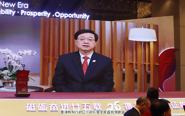 晚宴伊始,香港特別行政區(qū)行政長(zhǎng)官李家超作視頻致辭。李家超對(duì)長(zhǎng)期以來致力于香港繁榮穩(wěn)定和港湘交流發(fā)展的各界朋友表示衷心感謝。他指出,25年來,在祖國(guó)全力支持下,在香港特別行政區(qū)政府和社會(huì)各界共同努力下,“一國(guó)兩制”實(shí)踐在香港取得舉世公認(rèn)的成功。香港與內(nèi)地淵源深厚,在經(jīng)貿(mào)合作方面尤其緊密。未來五年是香港由治及興的關(guān)鍵時(shí)期。特區(qū)政府會(huì)務(wù)實(shí)有為,發(fā)展經(jīng)濟(jì),改善民生,積極融入國(guó)家發(fā)展大局,全面提升國(guó)際競(jìng)爭(zhēng)力,團(tuán)結(jié)各界,同為香港開新篇。