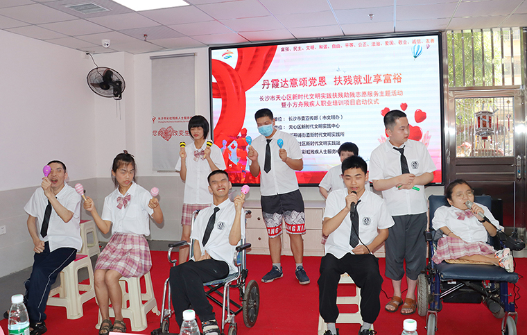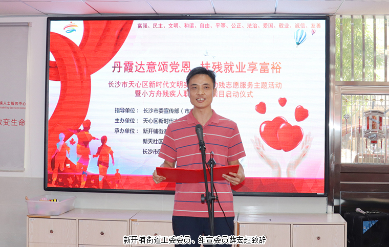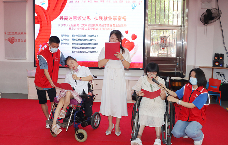 2022年7月14日,長沙市天心區(qū)新時代文明實踐扶殘助殘志愿服務(wù)主題活動暨小方舟殘疾人職業(yè)培訓(xùn)項目啟動儀式舉行。天心區(qū)委宣傳部副部長、區(qū)文明辦主任李貴勇,天心區(qū)文明辦副主任龔細梅,長沙市慈善總會項目辦主任朱佳,新開鋪街道工委委員、組宣委員薛宏超,新開鋪街道人大工委副主任陳娜,綠之韻公益基金會秘書長蔣文等受邀參加活動。