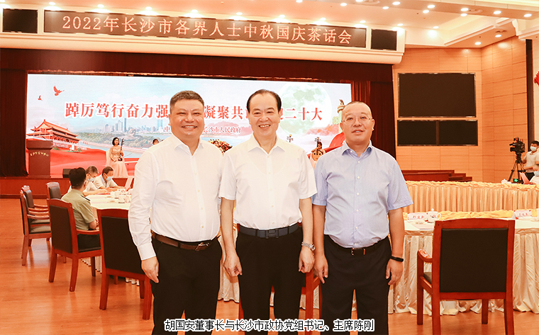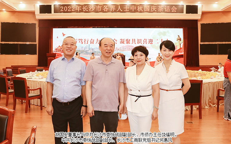 2022年9月9日,由中共長沙市委、長沙市政府主辦的2022年長沙市各界人士中秋國慶茶話會在長沙舉行。中共湖南省委常委、長沙市委書記吳桂英,市委副書記、湖南湘江新區(qū)黨工委書記、岳麓區(qū)委書記譚勇,市政協(xié)黨組書記、主席陳剛,市委常委、市紀(jì)律檢查委員會書記、市監(jiān)察委員會主任胡衛(wèi)兵,市委常委、長沙警備區(qū)政治委員馮紫英,市委常委、市委秘書長劉擁兵,市委常委、統(tǒng)戰(zhàn)部長、市政協(xié)黨組副書記劉匯等領(lǐng)導(dǎo)出席活動。長沙市人大代表、湖南省長沙市光彩事業(yè)基金會理事長、香港長沙聯(lián)誼會名譽(yù)會長、綠之韻集團(tuán)董事長胡國安與全市離退休老同志、各界人士代表歡聚一堂,飲一杯清茶,道一聲祝福,話一方發(fā)展。