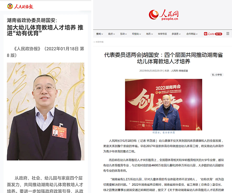 作為一名省政協(xié)委員,履職十多年來(lái),胡國(guó)安董事長(zhǎng)深入社區(qū)民情,積極參政議政,為湖南省經(jīng)濟(jì)發(fā)展獻(xiàn)計(jì)獻(xiàn)策,共提交了40份左右有價(jià)值的政協(xié)提案,涉及民創(chuàng)企業(yè)、青少年教育、扶危濟(jì)貧、健康養(yǎng)老、疾病預(yù)防、省市區(qū)發(fā)展等多個(gè)方面。2022年湖南省兩會(huì)期間,胡國(guó)安委員通過(guò)前期的調(diào)研,提交了《關(guān)于推動(dòng)湖南省幼兒體育教培人才培養(yǎng)的建議》提案。針對(duì)湖南省幼兒園一般沒(méi)有專職體育教師、幼兒體育教培機(jī)構(gòu)的教師來(lái)源復(fù)雜、幼兒體育教培機(jī)構(gòu)中兼職教師的比例高等問(wèn)題,他提出建議從政府、社會(huì)、幼兒園與家庭四個(gè)層面發(fā)力,共同推動(dòng)湖南省幼兒體育教培人才培養(yǎng)。長(zhǎng)沙師范學(xué)院體育學(xué)院高度重視該提案的社會(huì)效應(yīng),胡國(guó)安委員多次親自率領(lǐng)團(tuán)隊(duì)深入長(zhǎng)沙師范學(xué)院就學(xué)前體育教師教育和幼兒體育事業(yè)發(fā)展進(jìn)行調(diào)研。為感謝胡國(guó)安董事長(zhǎng)對(duì)長(zhǎng)沙師范學(xué)院教育事業(yè)的支持,會(huì)上,長(zhǎng)沙師范學(xué)院黨委副書(shū)記、校長(zhǎng)曹曉鮮向胡國(guó)安董事長(zhǎng)授予“長(zhǎng)沙師范學(xué)院榮譽(yù)校友”證書(shū)。