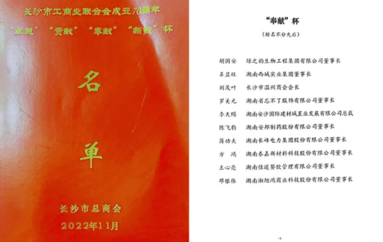 大會上頒發(fā)了“卓越”“貢獻(xiàn)”“奉獻(xiàn)”“新銳”杯四個(gè)企業(yè)家獎項(xiàng)。自2003年創(chuàng)立綠之韻集團(tuán)以來,胡國安董事長帶領(lǐng)綠之韻集團(tuán)在發(fā)展實(shí)業(yè)的同時(shí),積極承擔(dān)社會責(zé)任,產(chǎn)業(yè)富民,回饋社會。在振興實(shí)業(yè)的同時(shí),綠之韻積極承擔(dān)企業(yè)公民責(zé)任,踴躍參與了100多項(xiàng)社會公益項(xiàng)目,涉及賑災(zāi)濟(jì)困、興教助學(xué)、孤殘救助、醫(yī)療衛(wèi)生、修路飲水、養(yǎng)老醫(yī)療等多個(gè)領(lǐng)域,累計(jì)捐款捐物達(dá)7600多萬元。憑借帶領(lǐng)綠之韻集團(tuán)在企業(yè)經(jīng)營發(fā)展、稅收貢獻(xiàn)、社會責(zé)任打造等方面的出色表現(xiàn),胡國安董事長榮獲“奉獻(xiàn)杯”民營企業(yè)家獎項(xiàng)。獲此殊榮,胡國安董事長表示:2022年是黨的二十大召開之年,是“十四五”規(guī)劃實(shí)施的關(guān)鍵一年,是進(jìn)入全面建設(shè)社會主義現(xiàn)代化國家、向第二個(gè)百年奮斗目標(biāo)進(jìn)軍新征程的重要一年,也是綠之韻集團(tuán)“四五規(guī)劃”的收官之年。綠之韻作為一家立足長沙這片紅色沃土的民營企業(yè),將勇?lián)鷼v史使命,自覺把企業(yè)發(fā)展同國家、民族命運(yùn)連接起來,把企業(yè)實(shí)際和長沙發(fā)展優(yōu)勢結(jié)合起來,以“優(yōu)企業(yè)”助力“強(qiáng)省會”。同時(shí),要努力做回報(bào)社會的典范,繼續(xù)在各級領(lǐng)導(dǎo)的指導(dǎo)和支持下,帶領(lǐng)企業(yè)繼續(xù)服務(wù)三農(nóng)產(chǎn)業(yè),助力鄉(xiāng)村振興;堅(jiān)持創(chuàng)新創(chuàng)造,引領(lǐng)企業(yè)高質(zhì)量發(fā)展;積極履行企業(yè)公民責(zé)任,投身公益慈善事業(yè);積極融入長沙“強(qiáng)省會”戰(zhàn)略的恢弘征程,為鞏固拓展脫貧攻堅(jiān)成果、助推鄉(xiāng)村振興、全面建設(shè)現(xiàn)代化長沙、全力推動高質(zhì)量發(fā)展作出新的貢獻(xiàn)!