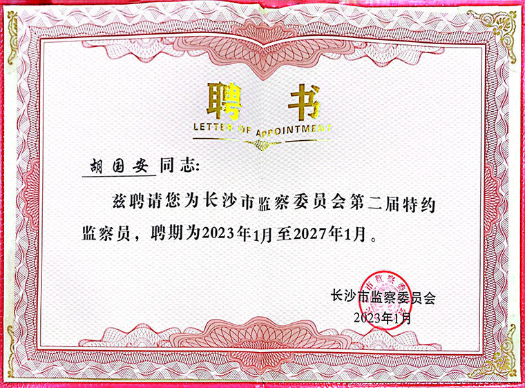 此次受聘為長(zhǎng)沙市監(jiān)察委員會(huì)特約監(jiān)察員,胡國(guó)安董事長(zhǎng)表示:特約監(jiān)察員既是一份榮譽(yù),更是一項(xiàng)嚴(yán)肅的政治責(zé)任。我將積極發(fā)揮自身優(yōu)勢(shì)履行好監(jiān)督職責(zé),以強(qiáng)烈的責(zé)任感和使命感,聚焦紀(jì)委監(jiān)委中心工作,對(duì)紀(jì)檢監(jiān)察機(jī)關(guān)和干部秉公執(zhí)紀(jì)執(zhí)法、嚴(yán)格謹(jǐn)慎用權(quán)等方面進(jìn)行監(jiān)督,發(fā)揮好建言獻(xiàn)策、參謀咨詢、橋梁紐帶、宣傳引領(lǐng)作用,講政治、有奉獻(xiàn)、當(dāng)表率,積極當(dāng)好監(jiān)督員、參謀員和宣傳員,為推進(jìn)全市紀(jì)檢監(jiān)察工作高質(zhì)量發(fā)展作出積極貢獻(xiàn)。