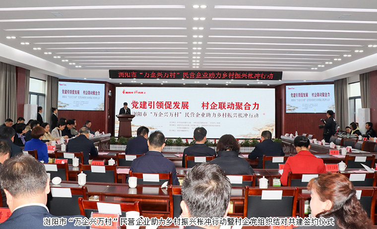 黨建引領(lǐng)促發(fā)展,村企聯(lián)動聚合力。2023年3月23日,瀏陽市“萬企興萬村”民營企業(yè)助力鄉(xiāng)村振興棖沖行動暨村企黨組織結(jié)對共建簽約儀式在瀏陽市棖沖鎮(zhèn)舉行。中共瀏陽市委副書記、統(tǒng)戰(zhàn)部部長戴武明,中共瀏陽市委常委、組織部部長唐安石,中共瀏陽市委常委、市委辦主任王坤球,瀏陽市人大常委會黨組成員、副主任唐洪勝,瀏陽市人民政府副市長劉來宏,瀏陽市政協(xié)副主席、市工商聯(lián)主席陳靜等領(lǐng)導出席活動。瀏陽市相關(guān)單位和部門負責人,棖沖鎮(zhèn)全體黨政領(lǐng)導,村黨總支書記、主任,鄉(xiāng)村振興駐村第一書記以及結(jié)對幫扶企業(yè)代表參加活動。綠之韻集團黨委書記劉云代表公司受邀參加活動。