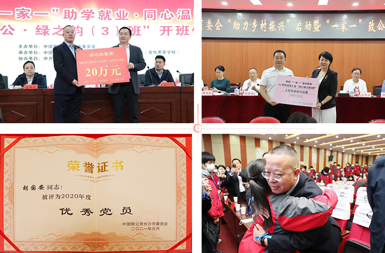 胡國安董事長表示,致力為公,是每一個致公黨員心中永遠不變的目標。作為湖南本土企業(yè),綠之韻集團始終把企業(yè)自身發(fā)展和國家經(jīng)濟社會發(fā)展緊密相結(jié)合,始終秉持“造福人類、回饋社會”的企業(yè)理念,踴躍參與多項社會公益事業(yè),積極響應(yīng)省委統(tǒng)戰(zhàn)部、致公黨省委、市委的號召,奮力投身“一家一”助學就業(yè)·同心溫暖工程、助力扶貧攻堅、鄉(xiāng)村振興工程。自2012年以來,先后捐資建設(shè)“致公·綠之韻班”“致公·綠韻生態(tài)班”“致公·綠之韻3班”,給予品學兼優(yōu)的困難學生更多學習機會,致力于為鄉(xiāng)村振興儲備更多優(yōu)質(zhì)人才;充分參與致公黨湖南省委會“致安”合作計劃,向致公黨湖南省委會在安化打造胡家村、高馬二溪村、神灣村和芙蓉村四個“同心致富村”捐贈愛心款項。先后被中國致公黨中央委員會評為“脫貧攻堅先進個人”,被致公黨湖南省委員會授予“全省抗擊新冠肺炎疫情先進個人”榮譽稱號,被致公黨長沙市委員會授予“優(yōu)秀黨員”及“防疫抗疫先鋒”榮譽稱號,并入選致公黨長沙市委會“四十年四十人”榮譽名錄。作為一名致公黨員,他將繼續(xù)牢記自己的身份和使命,在致公黨湖南省委的正確領(lǐng)導(dǎo)下,緊緊圍繞“僑海報國、參政議政、致公助學、鄉(xiāng)村振興”等工作主題,一絲不茍,爭做奉獻。在今后的工作中與廣大致公黨員、企業(yè)家一起,不斷提高自身素質(zhì),認真履行各項職責,再接再厲,不懈前行,努力為長沙各項事業(yè)的全面發(fā)展貢獻力量!
