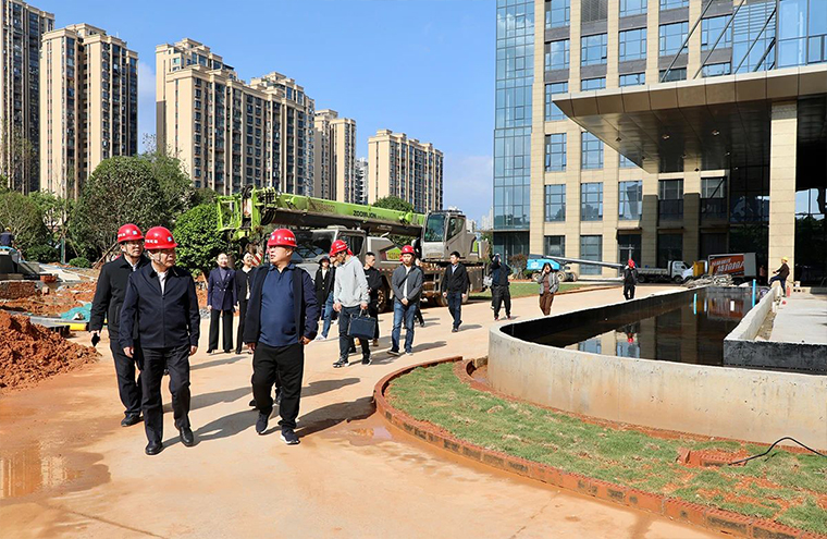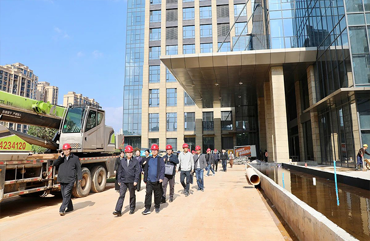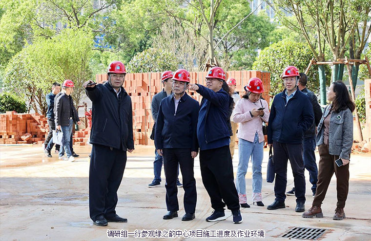 調(diào)研組一行在項目工作人員的引導(dǎo)下,查看了整個項目的施工進度及作業(yè)環(huán)境,了解綠之韻中心項目建設(shè)安全生產(chǎn)、綠色施工、未來發(fā)展等情況。
