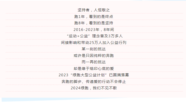 時間推移,初心不變,在歷史的長河里,二十年轉(zhuǎn)瞬即逝;但所有走過的路,都必留下痕跡。對于20歲的綠之韻而言,二十年里有太多值得記取的瞬間,我們和所有公益同行者所奉獻的公益和大愛,都將永不停步。站在新的起點上,感謝所有與我們一路同行的公益力量,感謝公益事業(yè)的管理者、捐助者、參與者、倡導(dǎo)者、傳播者。下一個二十年,綠之韻期待和所有關(guān)心公益事業(yè)的人一起,用更多愛心與善意溫暖這個世界。