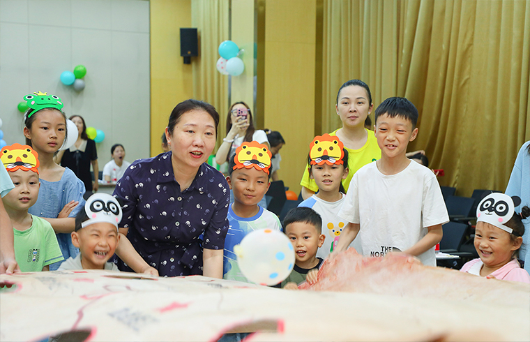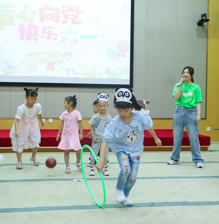彩色主題墻、彩色氣球?qū)⒒顒?dòng)現(xiàn)場(chǎng)裝扮得充滿著濃濃的節(jié)日氛圍。工作人員穿上玩偶服,裝扮成“韻小寶”、“小兔子”,為她們送上五彩繽紛的氣球和節(jié)日的祝福。在“圈圈接力賽”、“重走長(zhǎng)征路”、“滾圈圈”等一系列親子小游戲中,家長(zhǎng)與孩子密切配合、相互協(xié)作,全場(chǎng)成為一片歡樂的海洋;孩子們自信地展示自己的才藝,跳街舞、即興籃球表演、背誦唐詩......孩子們?cè)谖枧_(tái)上閃閃發(fā)光,出色的表演,贏得滿場(chǎng)喝彩與掌聲。