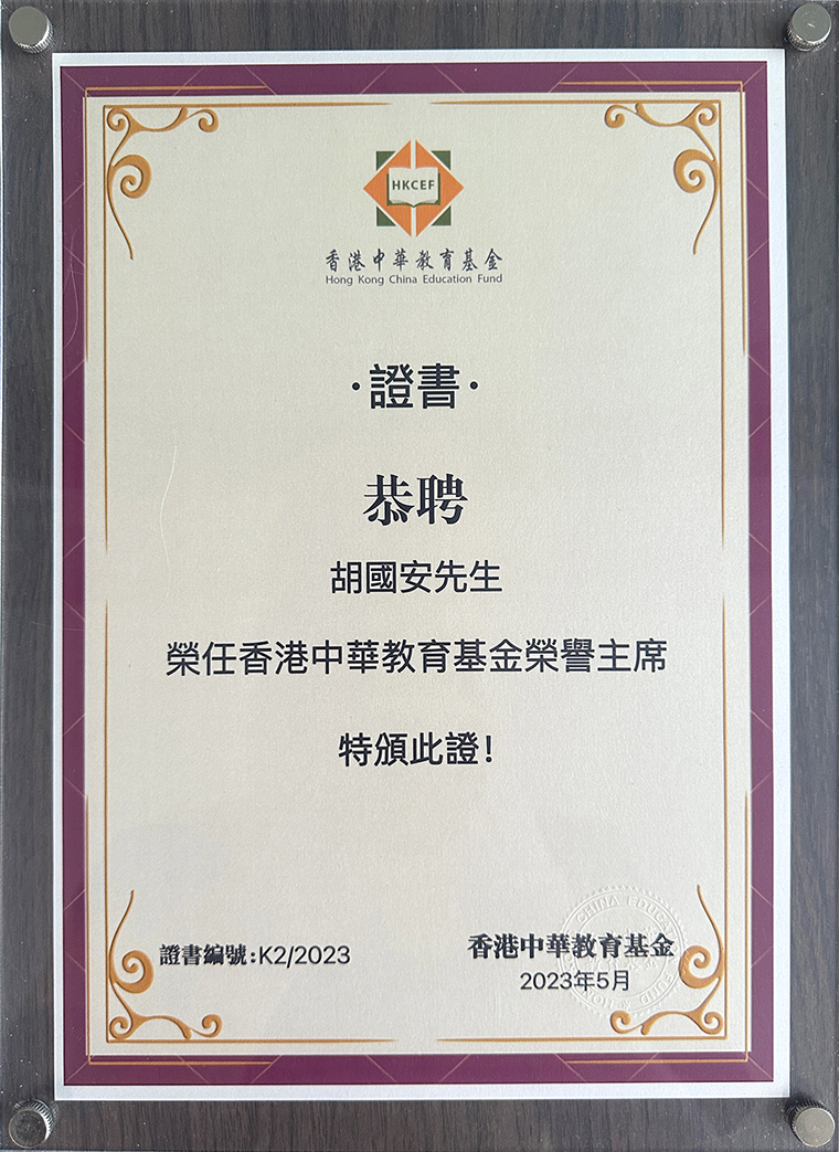 走訪期間,鑒于胡國(guó)安董事長(zhǎng)積極參與對(duì)外經(jīng)濟(jì)交流和合作洽談,注重國(guó)際人才培養(yǎng),投身湘港兩地社會(huì)事務(wù),推進(jìn)湘商港商交流洽談合作。香港金融管理學(xué)院校董會(huì)主席、香港中華教育基金理事長(zhǎng)、瑞科教育集團(tuán)董事長(zhǎng)王中英女士,香港金融管理學(xué)院校監(jiān)、香港中華教育基金主席張小舒博士親自為胡國(guó)安董事長(zhǎng)頒發(fā)“香港中華教育基金榮譽(yù)主席”牌匾。王中英女士表示,胡國(guó)安先生是香港金融管理學(xué)院榮譽(yù)校友,并始終以大愛奉獻(xiàn)、積極負(fù)責(zé)的態(tài)度感染著我們每一個(gè)人,他擁有豐富的經(jīng)驗(yàn)、專業(yè)的能力及國(guó)際影響力,相信在胡國(guó)安主席的帶領(lǐng)下,一定能繼續(xù)提升香港中華教育基金的品牌形象,促進(jìn)我們公益基金的可持續(xù)發(fā)展。
