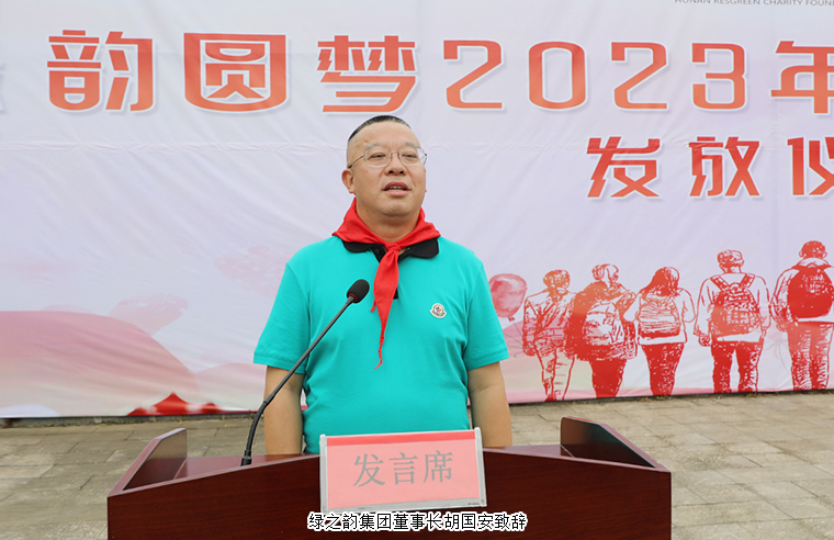 “時(shí)隔幾十年,今天我再次光榮的戴上鮮艷的紅領(lǐng)巾,心情很激動(dòng),有了不一樣的認(rèn)知,此時(shí)的身份不再是學(xué)生,更多的是一份責(zé)任和擔(dān)當(dāng)?!本G之韻集團(tuán)董事長胡國安深情地說,今天看到這么多優(yōu)秀的老師、學(xué)生代表,仿佛回到了兒時(shí),那個(gè)從安化大山里走出的小孩闖南走北最終回到故鄉(xiāng),有機(jī)會回報(bào)家鄉(xiāng),回報(bào)父母,回報(bào)母校,這是一件多么的幸福和榮耀的事情。他表示,少年強(qiáng)則國強(qiáng),青少年是祖國的希望與未來。教育幫扶一直是綠之韻公益基金會的重要關(guān)注點(diǎn)之一。今天在安化大橋?qū)W校設(shè)立專項(xiàng)獎(jiǎng)學(xué)金,給予那些品學(xué)兼優(yōu)的學(xué)生和辛苦耕耘的老師更多鼓勵(lì)和學(xué)習(xí)的機(jī)會,希望獲得鼓勵(lì)的優(yōu)秀師生代表可以堅(jiān)定理想信念,樹立遠(yuǎn)大抱負(fù),把這份殷殷愛心轉(zhuǎn)化為成才之志、奮發(fā)之源,在建設(shè)家鄉(xiāng)、投身鄉(xiāng)村振興、回報(bào)國家的生動(dòng)實(shí)踐中放飛青春夢想。捐資助學(xué)是一份愛心,回報(bào)桑梓是一份鄉(xiāng)情,返鄉(xiāng)創(chuàng)業(yè)是一種責(zé)任。今天在現(xiàn)場所有的老師、同學(xué)們也是未來安化的人才和棟梁,他希望每一個(gè)走出安化的人都可以不忘家鄉(xiāng)養(yǎng)育之恩,大力支持家鄉(xiāng)各項(xiàng)事業(yè)發(fā)展,為建設(shè)新時(shí)代高質(zhì)量、富饒美麗的安化貢獻(xiàn)一份力量。