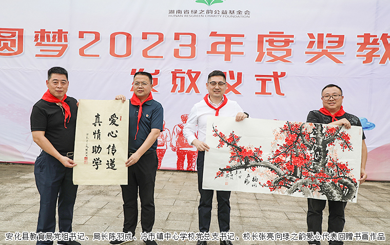 冷市鎮(zhèn)中心學(xué)校黨總支書記、校長張亮致歡迎辭。他首先代表學(xué)校對一直大力支持教育事業(yè)的綠之韻集團(tuán)愛心團(tuán)隊(duì)表示衷心的感謝。他表示,胡國安董事長情系家鄉(xiāng)教育,慷慨解囊為母校捐款50萬元,用于獎(jiǎng)勵(lì)教育教學(xué)成績突出的教師和品學(xué)兼優(yōu)的學(xué)生,以及對部分家庭生活特別困難的孩子予以資助。他回憶,早在2006年,胡國安董事長就出資10萬元改善大橋?qū)W校食堂環(huán)境,2012年“校車傳愛·書香助學(xué)”項(xiàng)目落地家鄉(xiāng)安化,綠之韻再次為安化大橋小學(xué)捐助了愛心校車與圖書;這十多年來,他的愛心助學(xué)善舉彰顯了新時(shí)代企業(yè)家的社會責(zé)任與擔(dān)當(dāng)情懷。大橋?qū)W校全體師生將不辜負(fù)大家的殷切期望,一定精誠團(tuán)結(jié),勤奮工作,努力學(xué)習(xí),攻堅(jiān)克難,勇毅前行。衷心祝愿“綠韻圓夢行動(dòng)”助學(xué)活動(dòng)能傳遞校園的希望之火。隨后,綠之韻集團(tuán)董事長胡國安與安化大橋?qū)W校校長黃軍共同簽署了捐贈協(xié)議。綠韻微看首席運(yùn)營官范林代表綠之韻公益基金會向?qū)W校捐贈50萬元愛心支票,安化縣教育局黨組書記、局長陳羽成,冷市鎮(zhèn)中心學(xué)校黨總支書記、校長張亮向綠之韻愛心代表回贈書畫作品。