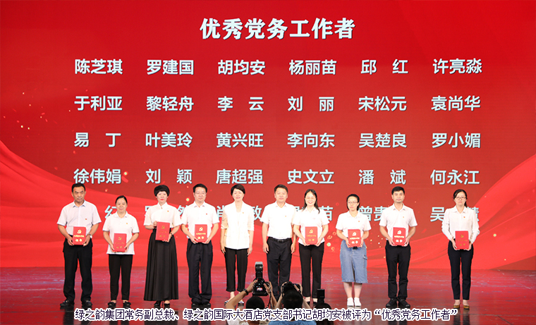 會(huì)上,瀏陽(yáng)經(jīng)開(kāi)區(qū)黨工委委員、管委會(huì)副主任何六生宣讀表彰文件。與會(huì)領(lǐng)導(dǎo)為獲得表彰的優(yōu)秀集體和個(gè)人頒獎(jiǎng)。綠之韻公益基金會(huì)黨支部憑借出色的黨建工作被中共瀏陽(yáng)經(jīng)濟(jì)技術(shù)開(kāi)發(fā)區(qū)工作委員會(huì)評(píng)為“先進(jìn)基層黨組織”;綠之韻集團(tuán)常務(wù)副總裁、綠之韻國(guó)際大酒店黨支部書(shū)記胡均安被評(píng)為“優(yōu)秀黨務(wù)工作者”;黨員楊丹、陳建新被評(píng)為“優(yōu)秀共產(chǎn)黨員”。