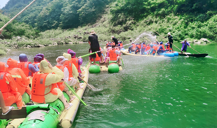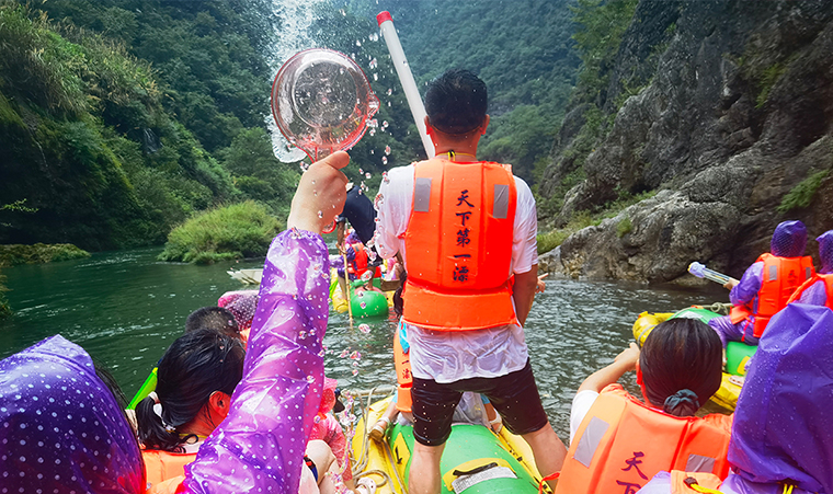 猛洞河河流坡降大,水急灘多浪奇,高大的峭壁直插水面,兩岸并相靠攏,形成幽深的峽谷景觀。沿河兩岸古木蒼天,蒼翠欲滴,奇石錯(cuò)落,流泉飛瀑隨處可見,下游一路水碧山青,風(fēng)光秀麗,野猴成群,溶洞奇特。撐起一只竹竿,掌舵的船夫開始帶綠之韻家人激情漂流。每每到一個(gè)急流的險(xiǎn)灘,大家情不自禁的大聲歡呼,水浪帶來的沖擊太刺激,太暢快。小船在河中輕快的飄蕩,時(shí)間在指縫中慢慢流逝,綠之韻家人們享受著在漂流竹筏的激情愜意時(shí)光,欣賞兩岸峭壁懸崖的各種風(fēng)景,或大小瀑布,或是造型奇特的樹, 穿急流、越險(xiǎn)灘、闖狹谷、打水仗,有驚無險(xiǎn),回味無窮。水在山中流,人在畫中游,經(jīng)歷了才知道什么叫“三生有幸”。