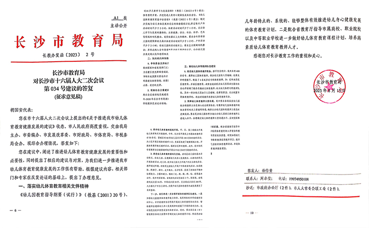 幼兒健康不僅關(guān)系到國民體質(zhì)健康和人的全面發(fā)展,更是關(guān)系到整個家庭的幸福。胡國安代表自提出《關(guān)于推進我市幼兒體育教育健康發(fā)展》的建議以來,多次親自率領(lǐng)團隊深入長沙師范學(xué)院就學(xué)前體育教師教育和幼兒體育事業(yè)發(fā)展進行調(diào)查研究。2022年9月16日,胡國安代表通過綠之韻公益基金會捐資40萬元與長沙師范學(xué)院共建湖南省幼兒體質(zhì)健康促進研究院,助力省市幼兒體質(zhì)健康促進事業(yè)發(fā)展。