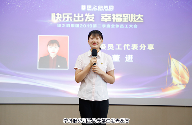 隨后,綠之韻集團董事、總裁勞嘉講話。她首先對二季度獲得優(yōu)秀稱號的集體與個人表示了祝賀。她在講話中表示,十六歲的綠之韻還是一家年輕的企業(yè),在成長過程中有曲折與困難,但對未來,更多的是期許、夢想和無限可能。2019年上半年,每一個綠之韻人都能以積極陽光的心態(tài)去迎接每一份挑戰(zhàn),戰(zhàn)勝每一個困難,感謝每一位家人的付出。人才,是一家企業(yè)基業(yè)長青、持續(xù)發(fā)展的關(guān)鍵因素,為更好地迎接下半年工作,公司正在開展年中系列專題培訓(xùn),希望每一位家人有所學(xué)、有所悟,從培訓(xùn)中、從學(xué)習(xí)中、從與領(lǐng)導(dǎo)同事的交流中,去開悟、去思考,獲得成長,成為更好的自己。不忘初心,奮進未來,“綠之韻”這三個字是我們所有人的初心,希望所有員工在下半年的工作中能繼續(xù)堅守崗位、同心協(xié)力、共同進步,再創(chuàng)佳績。我們都是追夢人,一起奔跑在追尋幸福的路上!