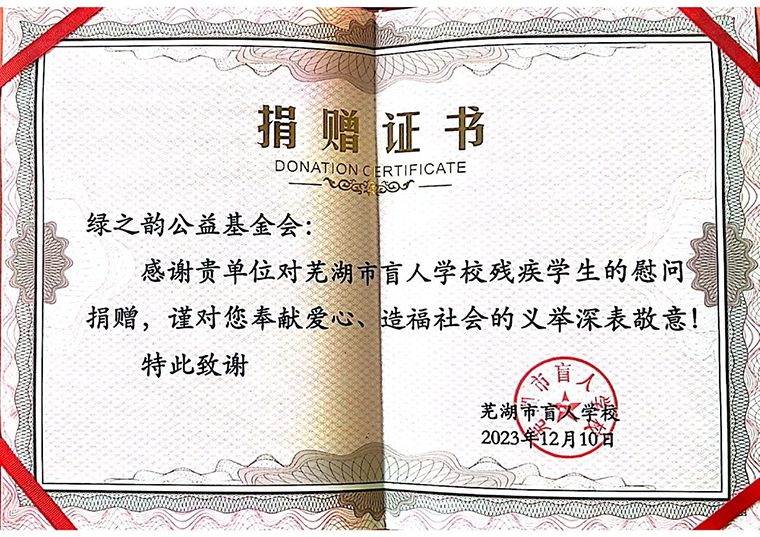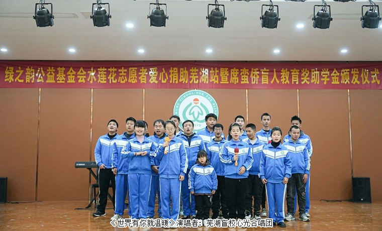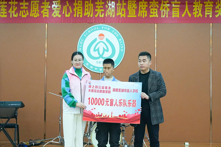 綠之韻水蓮花公益專項基金愛心捐助2023年度蕪湖盲校席蠻僑盲人教育助學(xué)金共30000元,以及10000元樂器和5000元的零食禮包。