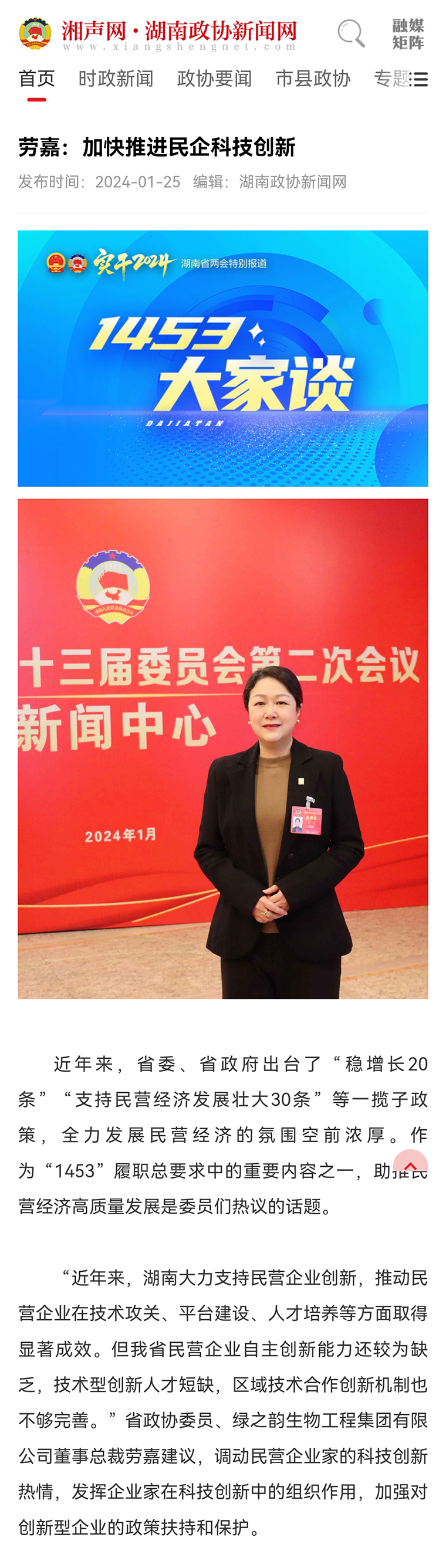 勞嘉委員列席湖南省第十四屆人民代表大會(huì)第二次會(huì)議,同各界別委員們一起聽(tīng)取并討論了《省政府工作報(bào)告》,圍繞省委、省政府的中心工作,聚焦湖南改革發(fā)展大局和人民群眾普遍關(guān)心的重點(diǎn)問(wèn)題,進(jìn)行深入探討和交流。會(huì)議期間,她向大會(huì)提報(bào)了《關(guān)于加快推進(jìn)民營(yíng)企業(yè)科技創(chuàng)新 錨定實(shí)現(xiàn)“三高四新”美好藍(lán)圖的建議》和《關(guān)于進(jìn)一步推進(jìn)普惠性托育服務(wù)高質(zhì)量發(fā)展 提升人民群眾幸福感的建議》提案。瀟湘晨報(bào)、湘聲報(bào)、紅網(wǎng)等多家媒體先后對(duì)勞嘉委員或提案進(jìn)行了新聞報(bào)道。