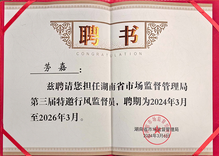 在湖南省市場監(jiān)督管理局聘請第三屆特邀行風監(jiān)督員會議上,湖南省市場監(jiān)督管理局一級巡視員歐陽黎明宣讀聘任通知。勞嘉總裁被續(xù)聘為湖南省市場監(jiān)督管理局第三屆特邀行風監(jiān)督員。她表示,此次受聘為第三屆省市場監(jiān)督管理局特邀行風監(jiān)督員,深感使命光榮、責任重大。未來,將繼續(xù)認真履行好市場監(jiān)管系統(tǒng)行風建設的監(jiān)督職責,發(fā)揮好行風監(jiān)督作用、橋梁紐帶作用和參謀智囊作用,為促進我省市場經(jīng)濟的高質量發(fā)展作出積極貢獻。