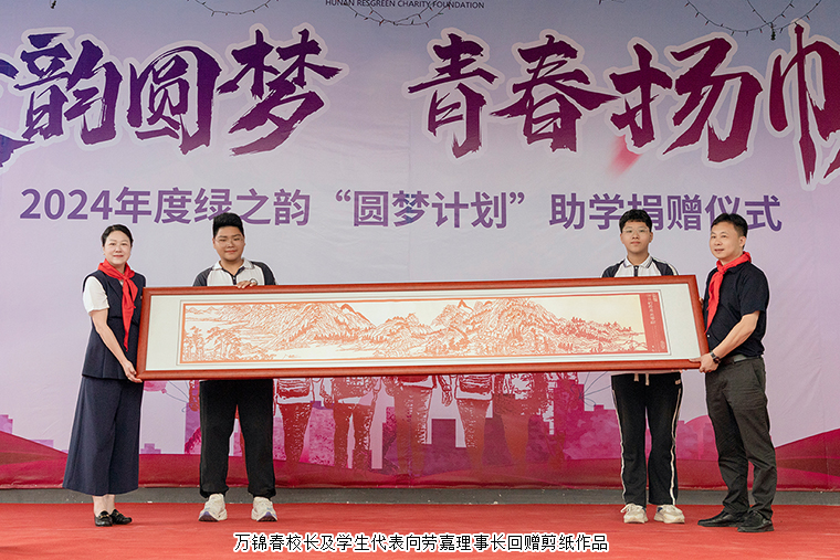在“綠韻圓夢(mèng)”捐贈(zèng)儀式上,勞嘉理事長(zhǎng)向揚(yáng)眉中學(xué)捐贈(zèng)20萬元助學(xué)基金,萬錦春校長(zhǎng)及學(xué)生代表向勞嘉理事長(zhǎng)回贈(zèng)剪紙作品《富春山居圖》,以表達(dá)對(duì)綠之韻開展助學(xué)公益項(xiàng)目的認(rèn)可和感謝。
