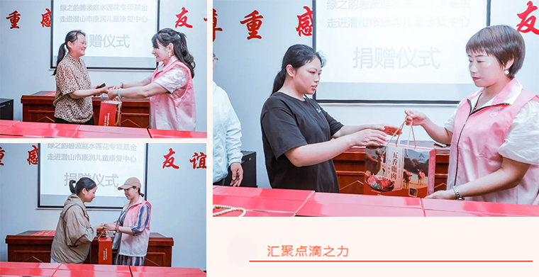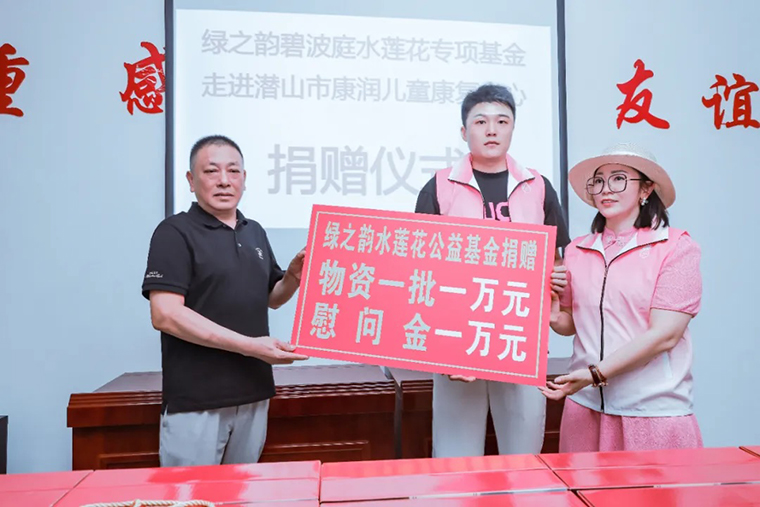由綠之韻碧波庭傳承委朱浩齊葛慧霞伉儷代表綠之韻碧波庭水蓮花專項(xiàng)基金 ,向潛山市康潤兒童康復(fù)中心捐贈(zèng)物資慰問金共計(jì)2萬元。