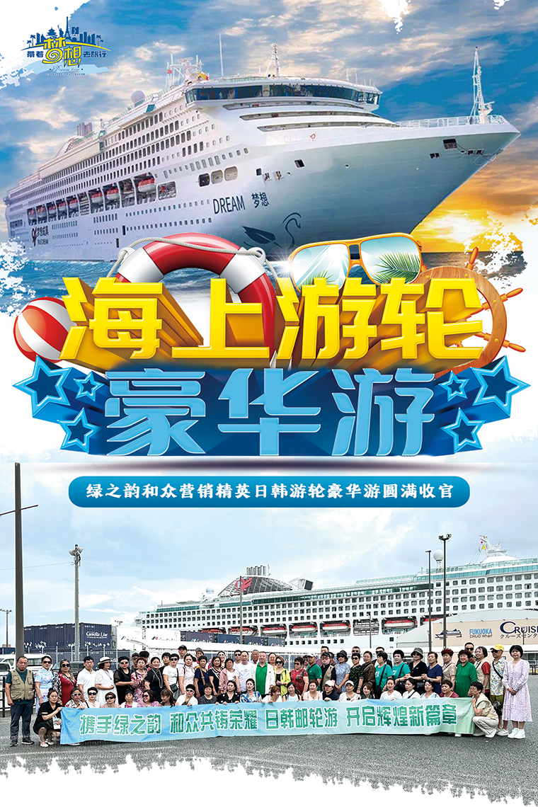 2024年8月23日—28日,綠之韻和眾精英日韓游輪豪華游在綠之韻集團常務副總裁胡均安、策略委員孫彩虹等領導的帶領下乘坐夢想號郵輪從天津港出發(fā),開啟了六天五晚的奇妙之旅。