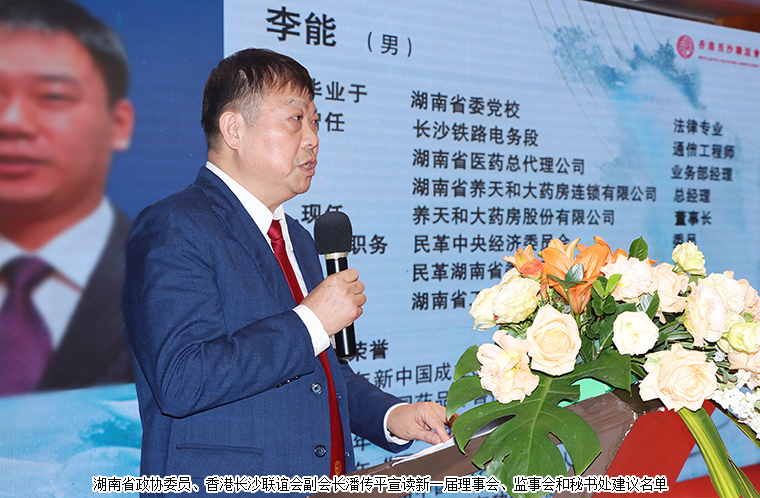 香港金融管理學(xué)院校董會(huì)主席王中英,湖南省政協(xié)常委、香港恒德利投資(集團(tuán))有限公司董事長(zhǎng)孫易兵,香港中文大學(xué)數(shù)學(xué)人工智慧中心主任,科技部香港聯(lián)合重點(diǎn)專項(xiàng)首席科學(xué)家曾鐵勇,中國(guó)音樂(lè)家協(xié)會(huì)副主席何沐陽(yáng),香港鄭中設(shè)計(jì)事務(wù)所(CCD)(002811)創(chuàng)始人、董事長(zhǎng)鄭忠,湖南高橋大市場(chǎng)董事總經(jīng)理羅曉,原香港大公文匯傳媒集團(tuán)副董事長(zhǎng)、總經(jīng)理歐陽(yáng)曉晴,長(zhǎng)沙市政協(xié)委員秦薇婷等當(dāng)選名譽(yù)會(huì)長(zhǎng);湖南省政協(xié)委員、香港善德集團(tuán)總裁張曉琴當(dāng)選榮譽(yù)創(chuàng)會(huì)會(huì)長(zhǎng);湖南省政協(xié)委員、香港周啟邦律師事務(wù)所 、湖南人和律師事務(wù)所潘傳平主任,長(zhǎng)沙市政協(xié)常委蔡達(dá),長(zhǎng)沙市政協(xié)常委、香港恒德利投資(集團(tuán))有限公司董事孫秀祖,長(zhǎng)沙市政協(xié)委員、香港同心總會(huì)會(huì)長(zhǎng)閔玉玲等當(dāng)選常務(wù)副會(huì)長(zhǎng);威勝控股(03393.HK)執(zhí)行董事、首席執(zhí)行官吉喆,廣東嘉應(yīng)制藥(002198)董事長(zhǎng)、養(yǎng)天和大藥房董事長(zhǎng)李能,長(zhǎng)沙市人大代表、興嘉生物董事長(zhǎng)黃逸強(qiáng),第十二屆湖南省政協(xié)常委、湘雅博愛(ài)康復(fù)醫(yī)院創(chuàng)始人、執(zhí)行董事周江林,空軍政治部文工團(tuán)獨(dú)唱演員、北京歌舞劇院獨(dú)唱演員米靚,香港屯門區(qū)議員、全國(guó)青聯(lián)委員、京港聯(lián)創(chuàng)會(huì)主席、清華大學(xué)法學(xué)博士陳貴和,香港銅鑼灣集團(tuán)地產(chǎn)有限公司董事長(zhǎng)陳長(zhǎng)宗等當(dāng)選副會(huì)長(zhǎng);長(zhǎng)沙市政協(xié)委員、香港國(guó)際新媒體集團(tuán)副總裁何苗當(dāng)選監(jiān)事長(zhǎng);傲迪瑪汽車(08418.HK)執(zhí)行董事聶麗當(dāng)選執(zhí)行秘書長(zhǎng);湖南省慈善總會(huì)副會(huì)長(zhǎng)、湖南省海外聯(lián)誼會(huì)副會(huì)長(zhǎng)、綠之韻集團(tuán)董事長(zhǎng)胡國(guó)安憑借其卓越的領(lǐng)導(dǎo)能力和豐富的管理經(jīng)驗(yàn)當(dāng)選為新一屆會(huì)長(zhǎng)。