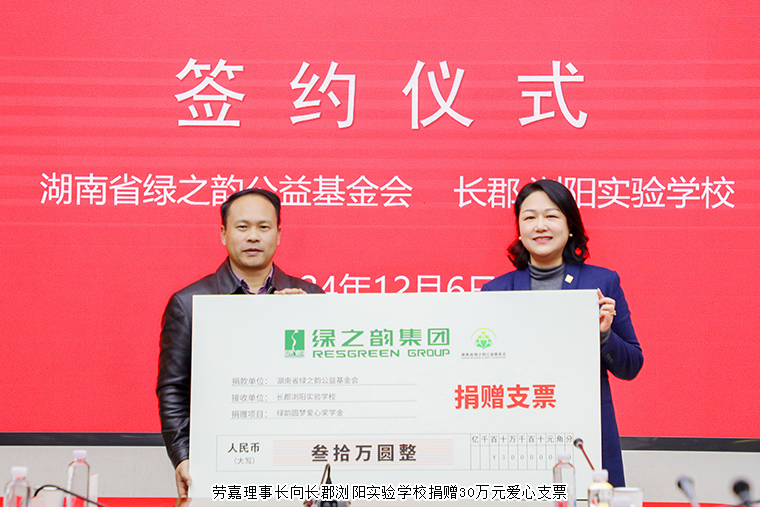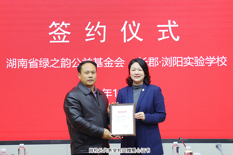 在現(xiàn)場(chǎng)領(lǐng)導(dǎo)嘉賓的見(jiàn)證下,蔣文秘書(shū)長(zhǎng)代表綠之韻公益基金會(huì)與長(zhǎng)郡瀏陽(yáng)實(shí)驗(yàn)學(xué)校簽訂校企共建協(xié)議,未來(lái)3年將陸續(xù)向?qū)W校捐贈(zèng)30萬(wàn)元專(zhuān)門(mén)設(shè)立愛(ài)心助學(xué)獎(jiǎng)學(xué)金,重點(diǎn)幫扶在校困難學(xué)生,改善他們的生活和學(xué)習(xí)環(huán)境。隨后,勞嘉理事長(zhǎng)向長(zhǎng)郡瀏陽(yáng)實(shí)驗(yàn)學(xué)校捐贈(zèng)愛(ài)心支票,肖校長(zhǎng)代表學(xué)?;刭?zèng)愛(ài)心證書(shū)。