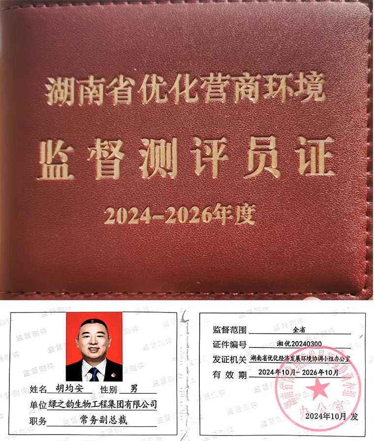 為進(jìn)一步加強(qiáng)營(yíng)商環(huán)境社會(huì)監(jiān)督,凝聚共商共建共享營(yíng)商環(huán)境工作合力,湖南省優(yōu)化經(jīng)濟(jì)發(fā)展環(huán)境協(xié)調(diào)小組辦公室開(kāi)展了2024—2026年度湖南省營(yíng)商環(huán)境監(jiān)督測(cè)評(píng)站(點(diǎn)、員)換屆工作,經(jīng)推薦報(bào)名、審核、公示等環(huán)節(jié),綠之韻集團(tuán)憑借在企業(yè)經(jīng)營(yíng)發(fā)展、社會(huì)責(zé)任擔(dān)當(dāng)以及行業(yè)內(nèi)的良好口碑等多方面的突出表現(xiàn),獲聘為“2024-2026年度湖南省優(yōu)化營(yíng)商環(huán)境監(jiān)督測(cè)評(píng)點(diǎn)”。綠之韻集團(tuán)常務(wù)副總裁胡均安獲聘為“湖南省優(yōu)化營(yíng)商環(huán)境監(jiān)督測(cè)評(píng)員”。