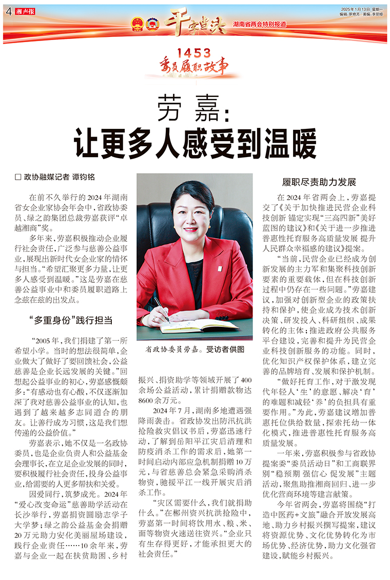 1月17日上午,中國(guó)人民政治協(xié)商會(huì)議湖南省第十三屆委員會(huì)第三次會(huì)議在長(zhǎng)沙圓滿完成各項(xiàng)議程,勝利閉幕。勞嘉委員表示,今年的政府工作報(bào)告中“穩(wěn)”與“新”這兩大關(guān)鍵詞,給自己留下了極為深刻的印象。在當(dāng)下復(fù)雜多變的經(jīng)濟(jì)形勢(shì)下,“穩(wěn)”字居于首位,為全省發(fā)展筑牢了堅(jiān)實(shí)根基,讓大家充滿底氣、信心愈發(fā)堅(jiān)定。而“新”主要體現(xiàn)在,省委省政府為實(shí)現(xiàn)“將長(zhǎng)沙打造成為全球研發(fā)中心城市”這一宏偉目標(biāo),相繼出臺(tái)了一系列創(chuàng)新的政策與有力舉措。她堅(jiān)信,這些新動(dòng)作必將為長(zhǎng)沙乃至整個(gè)湖南的經(jīng)濟(jì)發(fā)展注入磅礴動(dòng)力,推動(dòng)區(qū)域經(jīng)濟(jì)實(shí)現(xiàn)質(zhì)的飛躍。她還特別指出,報(bào)告中提及要持續(xù)在文旅融合的系統(tǒng)打造、區(qū)域聯(lián)動(dòng)、景點(diǎn)互通以及科技賦能等方面發(fā)力,這與她一直以來(lái)重點(diǎn)關(guān)注的領(lǐng)域高度契合。湖南不僅坐擁豐富多彩的旅游資源,還蘊(yùn)含著博大精深的中醫(yī)藥文化精髓。在此基礎(chǔ)上,進(jìn)一步推動(dòng)“中醫(yī)藥 + 文旅”深度融合,能夠打造出獨(dú)具湖南特色的產(chǎn)業(yè)發(fā)展新模式,從而將湖南的資源優(yōu)勢(shì)、文化優(yōu)勢(shì)切實(shí)轉(zhuǎn)化為市場(chǎng)優(yōu)勢(shì)與經(jīng)濟(jì)優(yōu)勢(shì)。這不僅能為湖南文化強(qiáng)省建設(shè)貢獻(xiàn)關(guān)鍵力量,還將為鄉(xiāng)村振興提供強(qiáng)大助力,開(kāi)辟出一條獨(dú)具特色的發(fā)展之路。