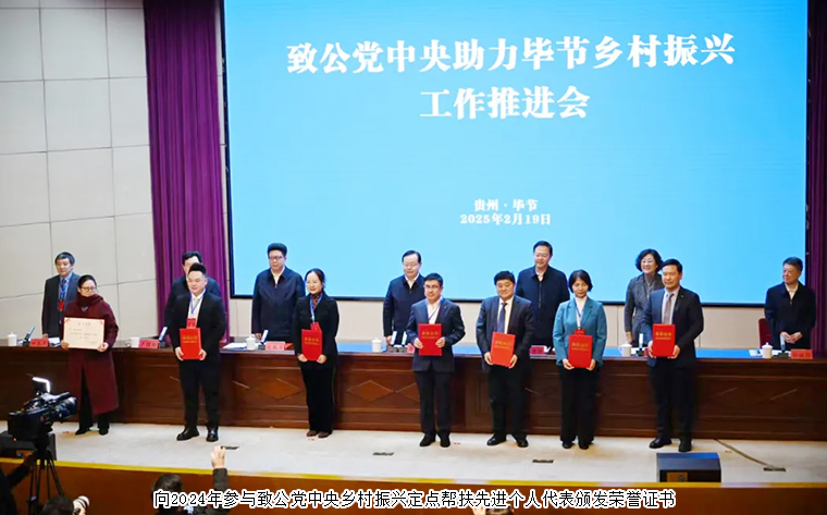 2024年,全國各級(jí)組織和廣大黨員在定點(diǎn)幫扶七星關(guān)區(qū)和統(tǒng)一戰(zhàn)線“地域+領(lǐng)域”組團(tuán)式幫扶畢節(jié)工作中取得一系列成果,涌現(xiàn)出一批先進(jìn)集體和先進(jìn)個(gè)人,充分展示了致公黨的優(yōu)良傳統(tǒng)和擔(dān)當(dāng)作為,不斷提升致公黨的社會(huì)影響力。會(huì)議表彰了2024年參與致公黨中央鄉(xiāng)村振興定點(diǎn)幫扶先進(jìn)集體和先進(jìn)個(gè)人。長(zhǎng)沙市人大代表、致公黨湖南省委會(huì)“數(shù)字互聯(lián)”委員會(huì)名譽(yù)主任、綠之韻集團(tuán)董事長(zhǎng)胡國安榮獲“2024年度致公黨中央鄉(xiāng)村振興定點(diǎn)幫扶先進(jìn)個(gè)人”榮譽(yù)稱號(hào)。