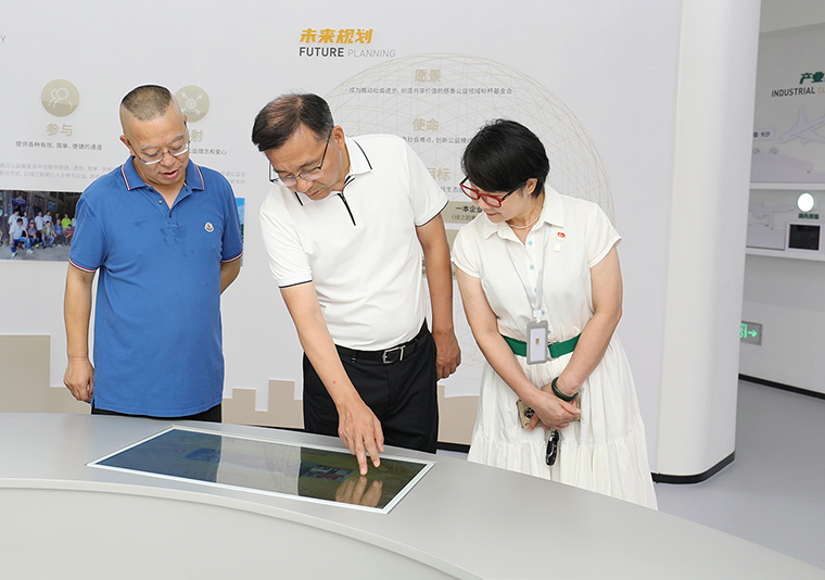 隨后,調(diào)研組一行來到位于綠之韻中心17層的數(shù)智化科技展廳。展廳設(shè)計深度融入企業(yè) “水之道” 理念,以水的旅程為敘事主線,將企業(yè)初心與情懷貫穿始終,同時融合 “東哲西技” 概念,展現(xiàn)獨特的文化底蘊。展廳運用數(shù)字技術(shù)打造互動體驗,構(gòu)建智慧型新時代中醫(yī)藥文化展示空間,通過立體空間多維度呈現(xiàn)集團企業(yè)文化、發(fā)展歷程、黨建公益、產(chǎn)品理念、科研實力及未來愿景等內(nèi)容。在參觀過程中,胡國安董事長向調(diào)研組詳細(xì)介紹了企業(yè)發(fā)展脈絡(luò),展廳內(nèi)豐富的最新科技成果與創(chuàng)新產(chǎn)品,更是直觀展現(xiàn)了綠之韻在大健康領(lǐng)域的積極探索與階段性成果。