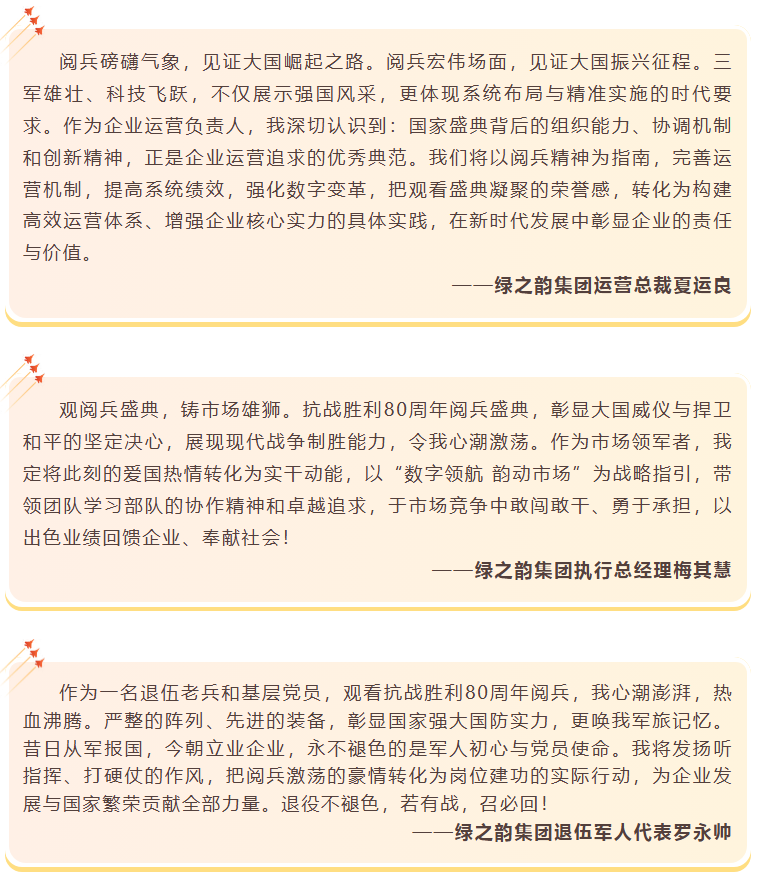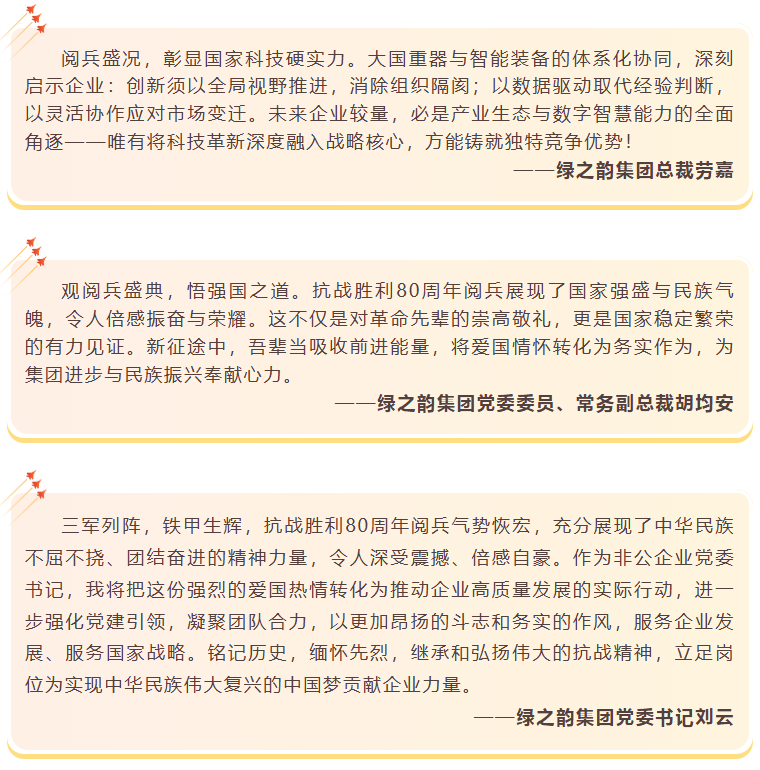 致敬偉大勝利,汲取奮進力量。綠之韻集團董事長胡國安在觀看閱兵儀式后表示,閱兵儀式展現(xiàn)的大國風(fēng)范和民族精神,正是綠之韻22年來砥礪前行的力量源泉。站在歷史與未來的交匯點,我們要更加深刻認識到企業(yè)發(fā)展與國家命運息息相關(guān)。觀看閱兵儀式是一次深刻的愛國主義教育和精神洗禮,抗戰(zhàn)精神是企業(yè)發(fā)展不可或缺的精神財富。通過此次觀閱活動,希望全體綠之韻人要進一步汲取歷史智慧、錘煉政治品格,將閱兵儀式所展現(xiàn)的團結(jié)奮進、自強不息的精神轉(zhuǎn)化為推動企業(yè)創(chuàng)新發(fā)展的實際行動。未來,綠之韻集團將繼續(xù)深化黨建與企業(yè)發(fā)展同頻共振,引領(lǐng)公司在新時代征程中踐行社會責(zé)任、展現(xiàn)企業(yè)擔當,為實現(xiàn)中華民族偉大復(fù)興貢獻力量。