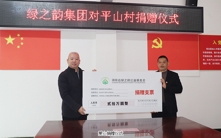 隨后的捐贈儀式上,綠之韻集團常務(wù)副總裁胡均安代表基金會向平山村捐贈20萬元愛心支票用于支持村級公共基礎(chǔ)設(shè)施建設(shè)。平山村黨支部書記梁建雄代表全村接收捐贈,并向綠之韻回贈了飽含感激之情的愛心錦旗。胡均安常務(wù)副總裁表示,作為一名安化籍企業(yè)家,同時也是一名安化縣人大代表,積極投身到建設(shè)家鄉(xiāng)的事業(yè)中去,是他與生俱來的責(zé)任與使命。綠之韻先后在安化投資建設(shè)黃精、杜仲等中藥材種植基地,捐建水電、道路、橋梁、生活廣場等硬件設(shè)施,為老人、婦女進行免費的兩癌篩查,為學(xué)校捐建校車、圖書、體育設(shè)備,為孩子們設(shè)立獎教獎學(xué)金,累計捐贈款物1000多萬,全方位支持家鄉(xiāng)鄉(xiāng)村振興建設(shè)、文化教育事業(yè)發(fā)展。今年5月20日,綠之韻集團在長沙人文地標(biāo)橘子洲舉行3000人綠跑大型公益品牌活動,現(xiàn)場捐贈100余萬元愛心款項至綠韻圓夢公益項目。其中,捐贈20萬用于平口鎮(zhèn)平山村村級公共設(shè)施項目建設(shè),促進鄉(xiāng)村振興建設(shè)及當(dāng)?shù)亟?jīng)濟發(fā)展,提高家鄉(xiāng)人民的幸福感、獲得感、滿足感。此次,帶領(lǐng)綠之韻集團黨委一行來到安化共聯(lián)共建,也希望盡己所能,將企業(yè)發(fā)展成果惠及家鄉(xiāng)人民,為建設(shè)新時代高質(zhì)量、富饒美麗的安化貢獻一份力量。