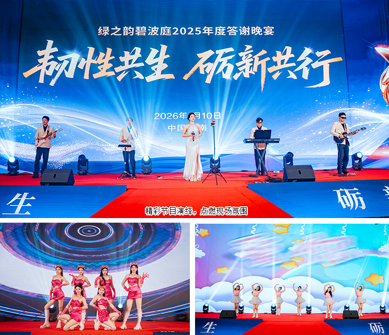 在悠揚(yáng)的樂(lè)曲與璀璨的燈光中,精彩的節(jié)目表演與驚喜連連的抽獎(jiǎng)環(huán)節(jié)交織上演,既有匠心獨(dú)具的節(jié)目演繹,也有驚喜不斷的互動(dòng)抽獎(jiǎng)環(huán)節(jié),綠之韻碧波庭家人們?cè)谂e杯暢談間細(xì)數(shù)奮斗足跡、共繪事業(yè)新篇。真摯的笑語(yǔ)、溫暖的相擁、充滿期許的目光,在璀璨燈火中交織成今夜最動(dòng)人的風(fēng)景,將綠之韻人“一家人、一條心”的情誼深深刻入這個(gè)溫暖的夜晚。