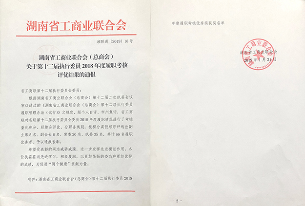 會議審議通過了《關(guān)于設(shè)立湖南省工商聯(lián)顧問委員會決定》,《湖南省工商聯(lián)(總商會)第十二屆執(zhí)行委員會第三次會議選舉辦法(草案),《湖南省工商聯(lián)(總商會)第十二屆執(zhí)行委員會第三次會議秘書長、常務委員侯選人名單》,《湖南省工商聯(lián)(總商會)第十二屆執(zhí)行委員會第三次會議替補執(zhí)行委員、常務委員侯選人名單》,通報表彰了2018年度執(zhí)行委員履職優(yōu)秀副主席、副會長、常委、執(zhí)委。胡國安董事長獲評2018年度履職優(yōu)秀副會長。