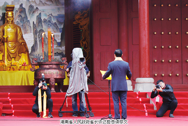 上午9時(shí)許,全場(chǎng)凝神肅立,氣氛莊嚴(yán),在悠揚(yáng)的古樂(lè)下,主祭人向舜祖上香及各界嘉賓依次向舜帝敬獻(xiàn)花籃 ; 全體參祭人員向舜帝深鞠三躬,虔誠(chéng)致敬,深情緬懷舜帝的地德天功、浩瀚恩澤。主祭人許達(dá)哲恭讀《祭舜帝文》,頌揚(yáng)著舜帝豐功偉績(jī),表達(dá)三湘兒女弘揚(yáng)舜帝精神,傳承中華文明,凝心聚力,砥礪奮進(jìn),為實(shí)現(xiàn)“兩個(gè)一百年”戰(zhàn)略目標(biāo),弘揚(yáng)中華優(yōu)秀傳統(tǒng)文化,建設(shè)富饒美麗幸福新湖南,譜寫(xiě)中華民族偉大復(fù)興中國(guó)夢(mèng)的湖南篇章而努力奮斗的雄心壯志。舜輝天下, 光照日月,讀畢祭文,許達(dá)哲將祭文帛書(shū)置于香爐中焚化,告慰舜帝英靈。禮炮、古樂(lè)再次響起,祭典儀式圓滿告成。
