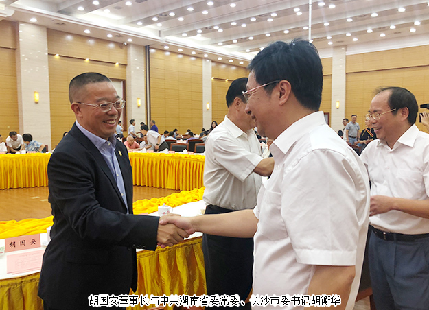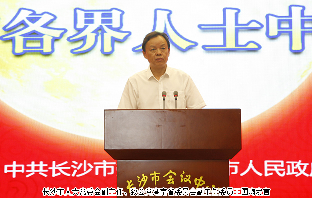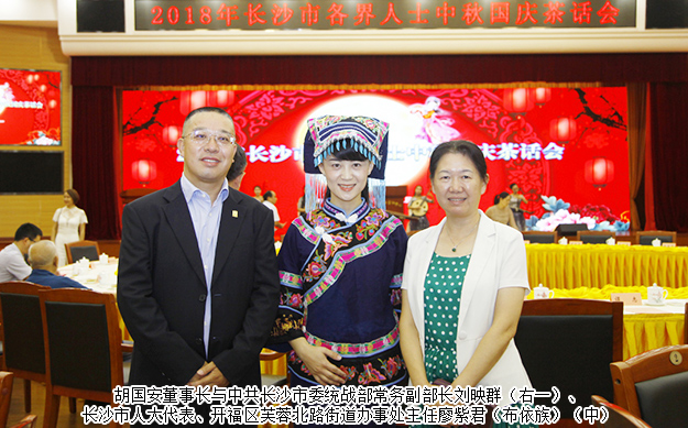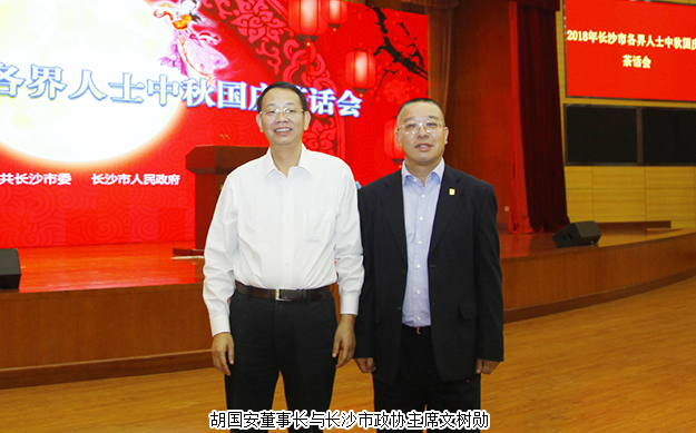 2018年9月21日,長沙市各界人士中秋國慶茶話會在市委會議中心舉行。中共湖南省委常委、長沙市委書記胡衡華,中共長沙市委副書記徐宏源,長沙市人大常委會主任程水泉,長沙市政協(xié)主席文樹勛,中共長沙市委常委、市委統(tǒng)戰(zhàn)部長譚小平等領(lǐng)導(dǎo)與全市離退休老同志、各界人士齊聚一堂,共慶佳節(jié),共話發(fā)展。湖南省政協(xié)委員,香港長沙聯(lián)誼會榮譽(yù)會長,香港長沙商會常務(wù)副會長,綠之韻集團(tuán)董事長胡國安受邀參加茶話會。