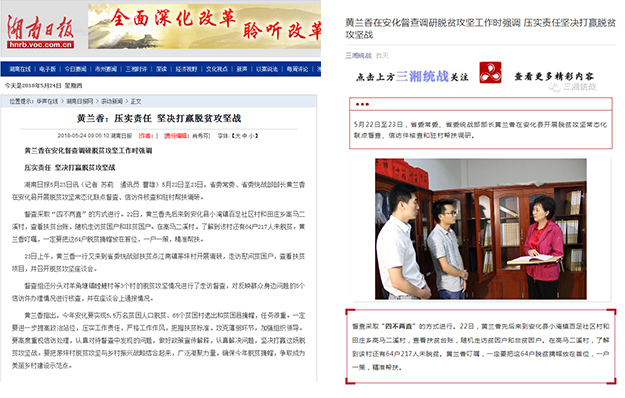 2018年5月22—23日,中共湖南省委常委、省委統(tǒng)戰(zhàn)部部長(zhǎng)黃蘭香一行赴湖南安化開展脫貧攻堅(jiān)調(diào)研工作。本次調(diào)研活動(dòng)圍繞目前安化縣開展脫貧攻堅(jiān)常態(tài)化聯(lián)點(diǎn)督查和駐村幫扶調(diào)研幾大主題進(jìn)行。調(diào)研期間,中共湖南省委常委、省委統(tǒng)戰(zhàn)部部長(zhǎng)黃蘭香,省委統(tǒng)戰(zhàn)部副部長(zhǎng)龍建湘,省交通運(yùn)輸廳黨組成員、副廳長(zhǎng)曾勝,省水利廳副巡視員楊光鑫,省扶貧辦副巡視員楊文輝,湖南省政協(xié)委員、湖南省工商聯(lián)(總商會(huì))副會(huì)長(zhǎng)、綠之韻集團(tuán)董事長(zhǎng)胡國(guó)安等深入安化縣,實(shí)地考察安化縣高馬二溪村、茅坪村脫貧攻堅(jiān)情況和駐村幫扶工作,慰問(wèn)貧困戶,并召開專題座談會(huì),調(diào)度駐村幫扶工作。中共湖南省益陽(yáng)市委常委、組織部部長(zhǎng)何俊峰,中共安化縣委書記熊哲文等陪同調(diào)研。