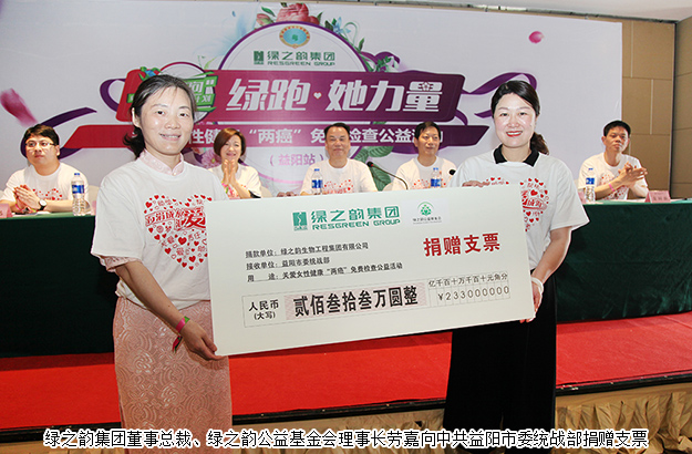 活動(dòng)現(xiàn)場(chǎng),綠之韻集團(tuán)董事總裁、綠之韻公益基金會(huì)理事長(zhǎng)勞嘉向益陽市委統(tǒng)戰(zhàn)部捐贈(zèng)233萬元支票。這筆愛心捐款將用于益陽市10000名城鎮(zhèn)低保常住女性進(jìn)行“兩癌”免費(fèi)公益檢查。勞嘉總裁在講話中表示,綠之韻集團(tuán)創(chuàng)立十五年以來,始終秉持“關(guān)愛生命,造福人類”的公益理念,在發(fā)展實(shí)業(yè)的同時(shí),積極承擔(dān)社會(huì)責(zé)任,產(chǎn)業(yè)富民,回饋社會(huì),踴躍參與和傾情捐助了100多項(xiàng)社會(huì)公益項(xiàng)目,累計(jì)捐贈(zèng)款物達(dá)6700多萬元。一直以來,綠之韻集團(tuán)高度重視婦女事業(yè)的發(fā)展,把守護(hù)女性健康作為企業(yè)從事大健康產(chǎn)業(yè)的一個(gè)重要努力方向。此次“綠跑·她力量 關(guān)愛女性健康——‘兩癌’免費(fèi)公益檢查活動(dòng)”,除了為益陽10000名貧困適齡婦女免費(fèi)提供“兩癌”檢查服務(wù),還將甄選一些特別貧困的“兩癌”患病家庭施以援手,進(jìn)行精準(zhǔn)幫扶。綠跑,是綠之韻集團(tuán)將“健康跑”和“主題公益”相融合一個(gè)大型公益計(jì)劃,截至目前已經(jīng)在湖南瀏陽、湘西吉首、長(zhǎng)沙松雅湖成功舉辦了三屆。今年6月,綠之韻集團(tuán)將繼續(xù)以“健康跑”的方式,凝聚社會(huì)各界愛心力量,廣泛關(guān)注貧困“兩癌”家庭,在宣傳“兩癌”科普知識(shí)的同時(shí),倡導(dǎo)國(guó)民在日常生活中保持健康積極的生活狀態(tài)。