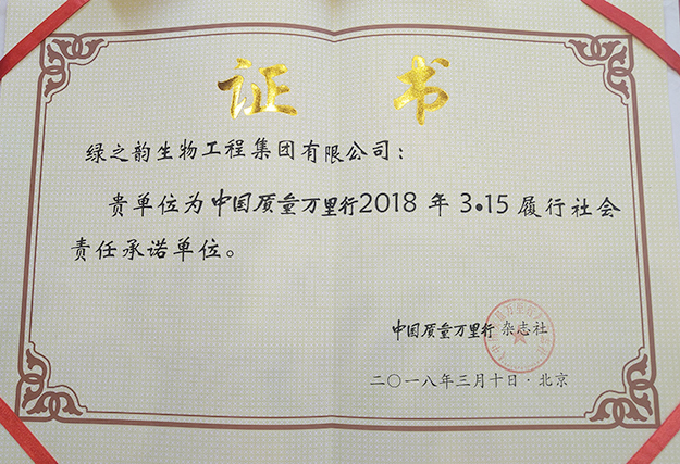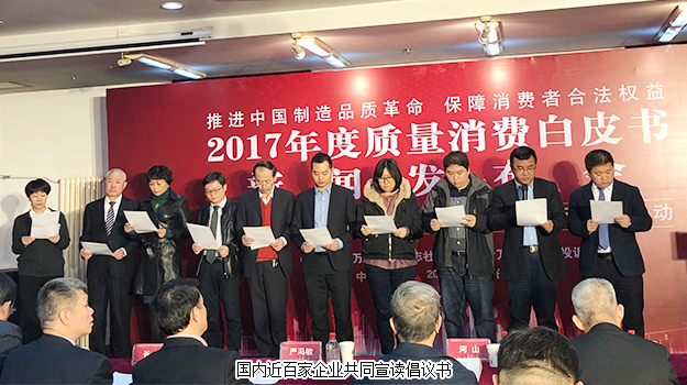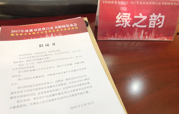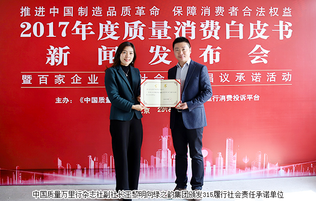 2018年3月10日,由《中國質(zhì)量萬里行》雜志社、中國質(zhì)量萬里行投訴平臺主辦的“2017年度質(zhì)量消費白皮書新聞發(fā)布會暨百家企業(yè)履行社會責(zé)任倡議承諾活動”在北京舉行。國家質(zhì)檢總局執(zhí)法督查司司長嚴馮敏,中國質(zhì)檢報刊社社長谷旭,中國法學(xué)會消法研究會會長河山,中消協(xié)原副秘書長武高漢,中國質(zhì)檢報刊社副社長兼副總編輯李本軍,國家日用電器質(zhì)量監(jiān)督檢驗中心副主任劉國榮,《中國質(zhì)量萬里行》雜志社社長汪鶴林、副社長王黎明等出席發(fā)布會。綠之韻集團總裁助理蔣文代表集團公司受邀參會。